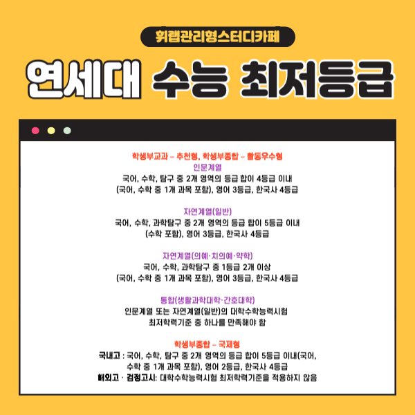 연세대 수능 최저학력기준의 특징은 영어와 한국사 최저 등급을 충족해야 하는 것이 특징으로
