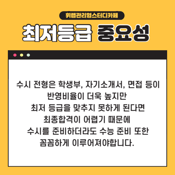그렇기 때문에 최저 등급을 맞출 수 있도록 수능 공부 또한 절대 손을 놓아선 안돼요